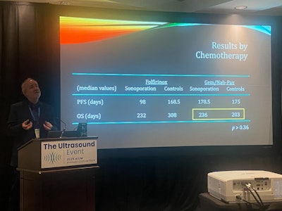 While the trial’s goal is to enroll 120 patients, Forsberg presented data from 65 patients who have complete data available as of March 20. The researchers compared the results to those of patients receiving the standard of care. The team also placed patients into different groups of chemotherapy regimens. Folfirinox was used in 49 patients, of which 25 were in the sonoporation arm. And either nab-paclitaxel or gemcitabine was used for 16 patients, even split into sonoporation and standard-of-care arms.