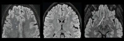 Two neuroradiologists reviewed FLAIR sequences from each MRI exam for the presence of at least one WMH and of abnormal WMHs (which the researchers defined as at least five or more punctate foci equal, at least one focus measuring more than 3 mm, or at least one focus in an unusual location).