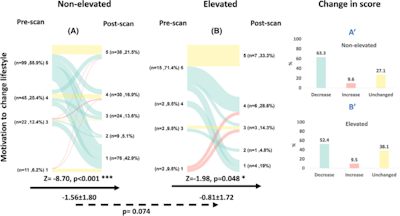 Motivation to change lifestyle before and after the disclosure of a non-elevated or an elevated Aβ result. A colored line connects each subject’s motivation to change lifestyle score (1–lowest motivation, 5–highest motivation) before and after disclosure. The color indicates whether there has been a decrease (green), increase (red), or no change (yellow) in the response. The black arrow represents the within-group comparison between the pre- and post-PET responses (Wilcoxon signed-rank test), while the absolute within-group change in score after disclosure is presented beneath it (value, SD). The dashed arrow represents the between-group comparison of the change in response between the non-elevated (A) versus the elevated (B) Aβ groups (mixed effects models; p value of the timepoint x result is presented). Bar plots describe the group-level change in motivation to change lifestyle scores after the disclosure of a non-elevated Aβ result (A’) or an elevated Aβ result (B’). P value. *p 0.05, *p 0.01, ***p 0.001. Aβ, amyloid beta; PET, positron emission tomography; SD, standard deviation.Courtesy Lesman-Segev et al., Alzheimer's & Dementia