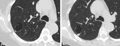 CT images in a 74-year-old female patient. (A) Axial image from a lung cancer screening shows a 3.1 cm by 2 cm unilocular cystic lesion with a 0.5 cm solid nodular component in the right upper lobe. The overall size of the lesion and solid nodular component ultimately grew. (B) Follow-up CT image obtained 37 months later, before resection, shows a 3.5 cm by 2.4-cm lesion with a 0.8-cm solid component. This lesion was pathologically proven to be invasive adenocarcinoma. Images and caption courtesy of the RSNA.