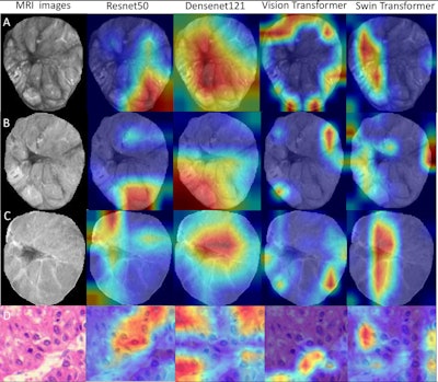 Deep-learning radiopathomics models visualization. (A-D) Gradient-weighted class activation mapping (Grad-CAM) heatmaps of ResNet50, DenseNet121, Vision Transformer, and Swin Transformer models are shown based on the axial arterial-phase images, portal venous phase images, hepatobiliary phase images, and hematoxylin eosin-stained images (original magnification, ×100) in a 71-year-old female patient with hepatocellular carcinoma. Red designates the activation region associated with vessels completely encapsulating tumor clusters. Images and caption courtesy of the RSNA.