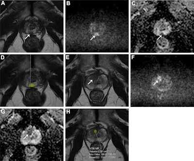 MRI scans show two areas of clinically significant prostate cancer in a 65-year-old man with a prostate-specific antigen level of 8.23 ng/mL. Images are (A, E) axial T2-weighted images, (B, F) axial diffusion-weighted images obtained with a b value of 1500 sec/mm2, (C, G) axial apparent diffusion coefficient images, and (D, H) lesion masks generated by the deep learning algorithm (DLA) on T2-weighted images. The DLA detected a lesion in the right posteromedial peripheral zone of the apex (D), which was assigned as Prostate Imaging Reporting and Data System (PI-RADS) 4. A radiologist also detected the lesion and assigned it PI-RADS 4 (arrow in A-C). A lesion in the right anterior transition zone (H) was detected by the DLA, which was assigned PI-RADS 4. The radiologist did not detect the lesion (arrow in E-G). Both lesions were confirmed as prostate cancer with Gleason grade group 2. Caption and image courtesy of RSNA.