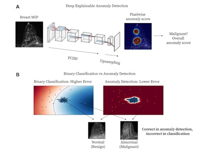 A method overview of the explainable AI model. (A) Diagram shows deep explainable anomaly detection at breast MRI. A maximum intensity projection (MIP) of a breast is passed to a fully convolutional neural network model trained using an explainable anomaly detection loss function (fully convolutional data description [FCDD]). The model directly outputs an up-sampled heat map of the anomalous pixels (anomaly heat map). The mean anomaly score across all pixels is used to classify a case as abnormal (malignant) or not. (B) Diagram shows a conceptual comparison between binary classification and anomaly detection: Shading represents the learned normal (blue) and abnormal (red) feature spaces, and dots represent individual normal (blue) and abnormal (red) cases. Binary classification learns a classification boundary between normal and abnormal cases, but model performance is affected by the scarcity and variability of malignant cases. Anomaly detection focuses on robustly learning the normal class and aims to identify abnormal cases accurately under these conditions.A method overview of the explainable AI model. (A) Diagram shows deep explainable anomaly detection at breast MRI. A maximum intensity projection (MIP) of a breast is passed to a fully convolutional neural network model trained using an explainable anomaly detection loss function (fully convolutional data description [FCDD]). The model directly outputs an up-sampled heat map of the anomalous pixels (anomaly heat map). The mean anomaly score across all pixels is used to classify a case as abnormal (malignant) or not. (B) Diagram shows a conceptual comparison between binary classification and anomaly detection: Shading represents the learned normal (blue) and abnormal (red) feature spaces, and dots represent individual normal (blue) and abnormal (red) cases. Binary classification learns a classification boundary between normal and abnormal cases, but model performance is affected by the scarcity and variability of malignant cases. Anomaly detection focuses on robustly learning the normal class and aims to identify abnormal cases accurately under these conditions.RSNA