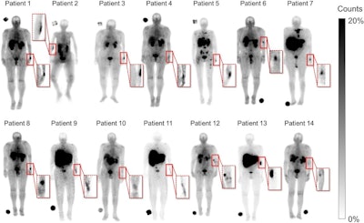 Planar gamma camera images (conjugate view geometric mean) of 14 patients with identified extravasations (highlighted in red dashed box) acquired using Philips XCT (patients 1-4) and Siemens Symbia 1 and 2 SPECT/CT systems (patients 5-14). All patients, except patient 2, had infusion in left arm. Gray scale was narrowed to 20% to enhance visualization of extravasations.Journal of Nuclear Medicine