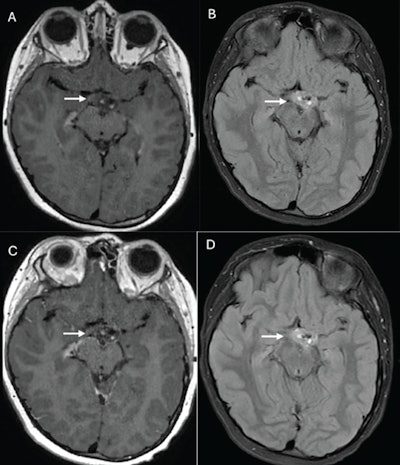 10-year-old boy who underwent brain MRI examinations due to optic tract glioma (A, B) Axial postcontrast 3D T1-weighted fast-spin echo (A) and fluid-attenuated inversion-recovery image or sequence (FLAIR) (B) images from examination performed using gadoterate meglumine. (C, D) Axial postcontrast 3D T1-weighted gradient-recalled echo (C) and FLAIR (D) images from examination performed using gadopiclenol. Images show expansile lesion centered in left optic tract, with punctate enhancement medially and posteriorly (arrow, A-D). Readers 1 and 2 assigned score for border delineation on 3D T1-weighted fast-spin echo of -2 and -1; for border delineation on FLAIR of 0 and 0; for contrast enhancement on 3D T1-weighted fast-spin echo of -2 and -2; for contrast enhancement on FLAIR of 0 and 1; for internal morphology on 3D T1-weighted fast-spin echo of -1 and -2; and for internal morphology on FLAIR of 0 and 0. Negative values indicate preference for gadopiclenol-enhanced examination, whereas positive values indicate preference for gadoterate meglumine-enhanced examination. Image and caption courtesy of the AJR.10-year-old boy who underwent brain MRI examinations due to optic tract glioma (A, B) Axial postcontrast 3D T1-weighted fast-spin echo (A) and fluid-attenuated inversion-recovery image or sequence (FLAIR) (B) images from examination performed using gadoterate meglumine. (C, D) Axial postcontrast 3D T1-weighted gradient-recalled echo (C) and FLAIR (D) images from examination performed using gadopiclenol. Images show expansile lesion centered in left optic tract, with punctate enhancement medially and posteriorly (arrow, A-D). Readers 1 and 2 assigned score for border delineation on 3D T1-weighted fast-spin echo of -2 and -1; for border delineation on FLAIR of 0 and 0; for contrast enhancement on 3D T1-weighted fast-spin echo of -2 and -2; for contrast enhancement on FLAIR of 0 and 1; for internal morphology on 3D T1-weighted fast-spin echo of -1 and -2; and for internal morphology on FLAIR of 0 and 0. Negative values indicate preference for gadopiclenol-enhanced examination, whereas positive values indicate preference for gadoterate meglumine-enhanced examination. Image and caption courtesy of the AJR.