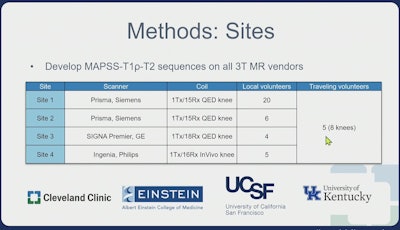 Now evaluating their technique in a multisite, multivendor study, Zhang and colleagues used a 3D MAPSS [magnetization-prepared angle-modulated partitioned k-space spoiled gradient echo snapshots] sequence on three 3-tesla MR scanners: Prisma by Siemens Healthineers with a 15-channel knee coil, Signa Premier by GE HealthCare with an 18-channel knee coil, and Ingenia by Philips with a 16-channel knee coil.