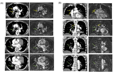 Axial (A) and Coronal (B) CTPA show multiple partial intraluminal filling defects along the course of the right middle lobar segmental branches (medial segment) (yellow arrow) and lower lobar and postero-medial segmental branches (green arrow). Note the low-signal filling defects on the axial and coronal 0.55T MRI sequence. Caption and image courtesy of Rudy Rizzo, PhD, University of Michigan, and ISMRM