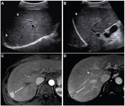 (A,B) Images from an initial ultrasound examination showed no identifiable lesions and received a consensus ultrasound category of US-1. Nearly the entire liver is visualized, with minimal shadowing (“s”, A and B), and the examination received consensus result of VIS-A. The AFP level was 7.1 ng/mL on assessment six months before the ultrasound, 9.1 ng/mL on assessment three months before examination, and 14.2 ng/mL on assessment on exam day. The AFP result was thus assessed as positive based on a progressive increase on two consecutive tests. The atient was considered to have negative surveillance result according to LI-RADS Ultrasound Surveillance v2017, but positive surveillance result according to LI-RADS Ultrasound Surveillance v2024. (C-D) Axial arterial-phase (C) and portal-venous phase (D) T1-weighted images from subsequent gadoxetic acid-enhanced MRI show a 2-cm arterial-phase hyperenhancing observation (arrow, C) with portal-venous washout (arrow, D) in segment 7. This observation was classified on MRI as LR-5, thus meeting the present study’s reference standard for diagnosis of HCC. The mass is located in the periphery of the liver, an anatomic area where ultrasound visualization can be challenging due to shadowing.ARRS