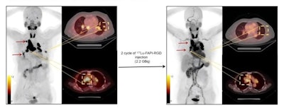 A 56-year-old woman with disease progression after surgery received Lu-177 FAPI-RGD at 2.2 GBq/cycle. Baseline Ga-68 FAPI-RGD PET/CT revealed intense Lu-177 FAPI-RGD uptake in most metastatic lesions including lymph node and lung modules (left, arrows and square box). After two treatment cycles, a restaging Ga-68 FAPI-RGD-PET/CT scan revealed a significant reduction in tumor size in most of the metastatic lesions. Furthermore, most of the lesions in the lungs have disappeared (right, arrows and square box).Jialing Xiang and SNMMI