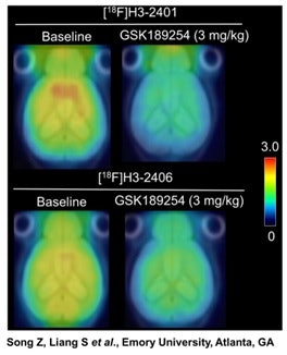 Representative summed PET images of mouse brain uptake under baseline and GSK189254-blocking (3 mg/kg prior to tracer injection) conditions.Representative summed PET images of mouse brain uptake under baseline and GSK189254-blocking (3 mg/kg prior to tracer injection) conditions.Zhendong Song, PhD, and SNMMI