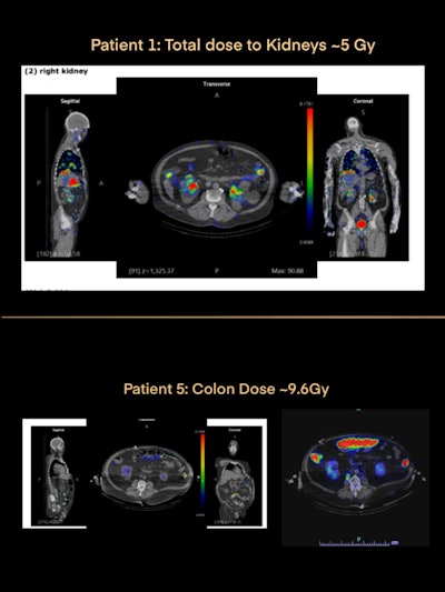 Top image displays a patient assessed for acute renal failure following third Lutathera administration where 3D dosimetry showed an average-per-administration kidney absorbed dose of 5 Gray, with total course of therapy being well under toxicity limits. Bottom image displays a patient’s absorbed dose to the colon after his first dose of Pluvicto where 3D dosimetry was used to confirm transient bowel obstruction leading to treatment management.Taylor Gillespie and SNMMI