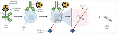Targeted alpha therapy's mechanism of action. Graphic courtesy of John Tackett and Vani Vijayakumar, MD.Targeted alpha therapy's mechanism of action. Graphic courtesy of John Tackett and Vani Vijayakumar, MD.
